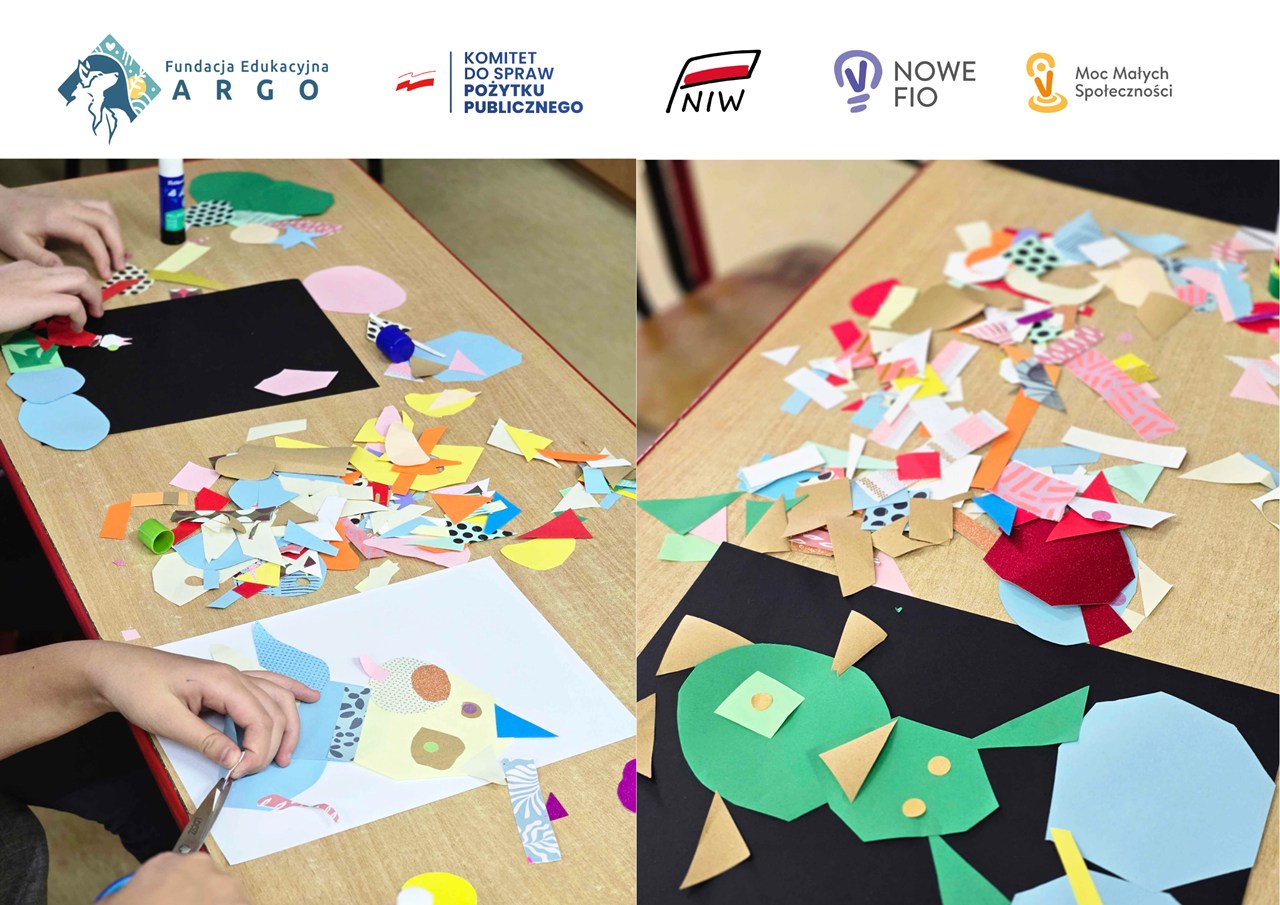 Druga część warsztatów była artystyczna. Uczniowie pracowali techniką kolażu, rozwijając kreatywność i abstrakcyjne myślenie. Zanim powstały prace, prowadzący pokazali dzieciom, jak sprawnie mózg potrafi analizować sygnały wizualne: od emocji psa po uniesioną brew nauczycielki. Te same obszary mózgu aktywowały się później podczas tworzenia.