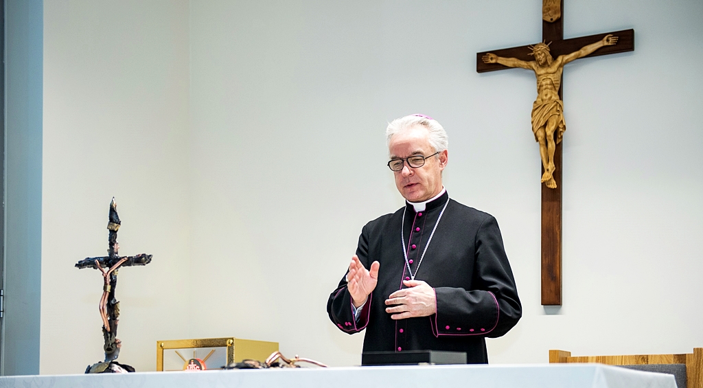 Zwracając się do kapelanów z parafii cywilno-wojskowej w Legionowie, którzy będą pełnili posługę w kaplicy, wyraził wdzięczność za ich działalność duszpasterską. – Dziękuję za posługę duchową, prowadzoną w kaplicy, wspierającą chorych. Chciałbym przekazać na ręce księdza proboszcza ten wyjątkowy dar, krucyfiks. Krzyż złożony z elementów wojskowych, który jak najbardziej pasuje do kaplicy w szpitalu wojskowym – powiedział wręczając na ręce proboszcza parafii, ks. płk. Marcina Czeropskiego krzyże wykonane z odłamków i elementów wojskowych oraz ryngraf z wizerunkiem Matki Bożej.