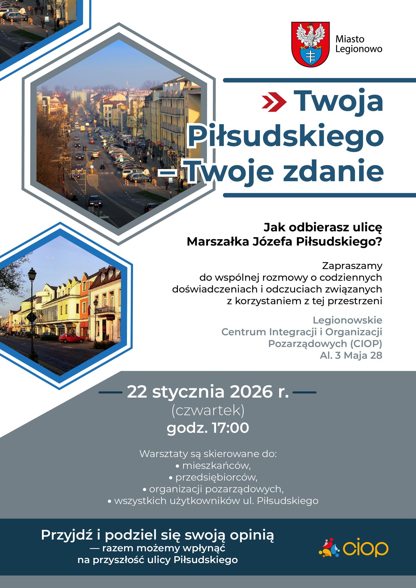 Urząd Miasta Legionowo organizuje spotkanie konsultacyjne poświęcone przyszłości ulicy Piłsudskiego. Celem spotkania jest zebranie opinii i doświadczeń osób, które na co dzień korzystają z tej przestrzeni.