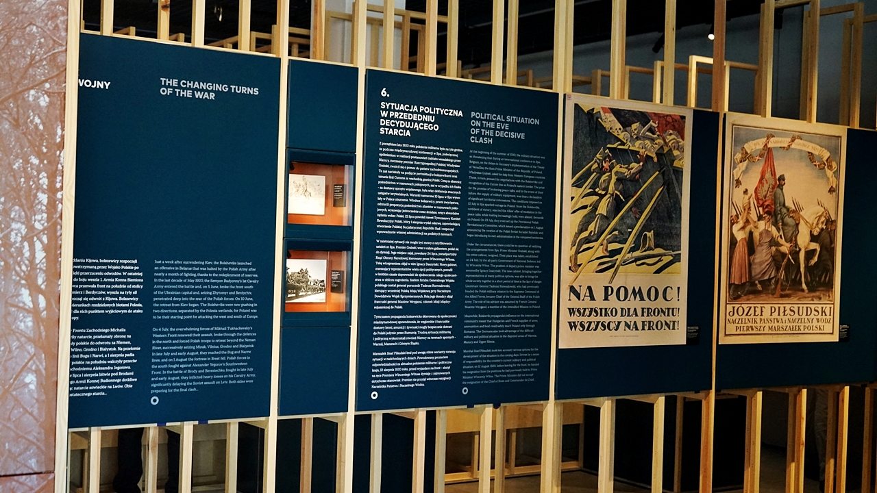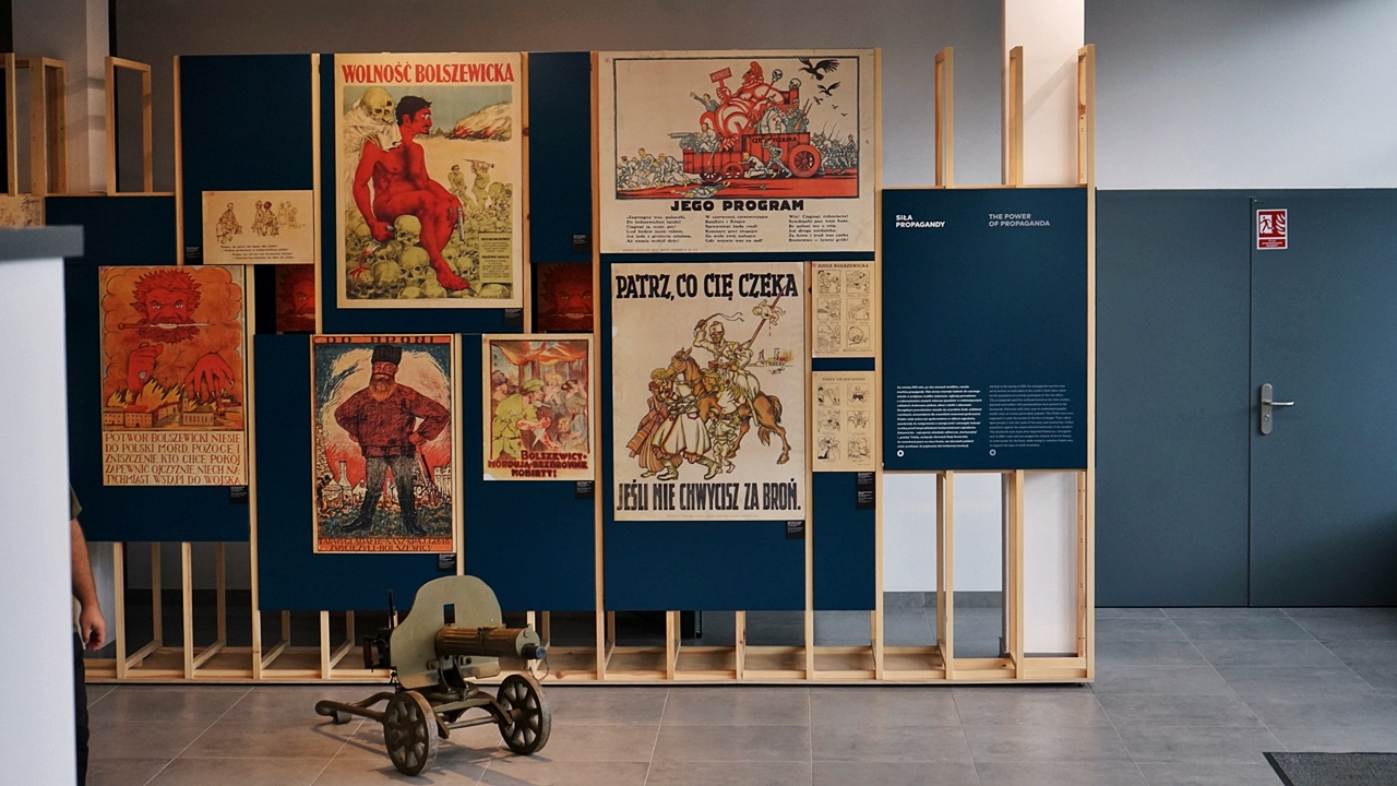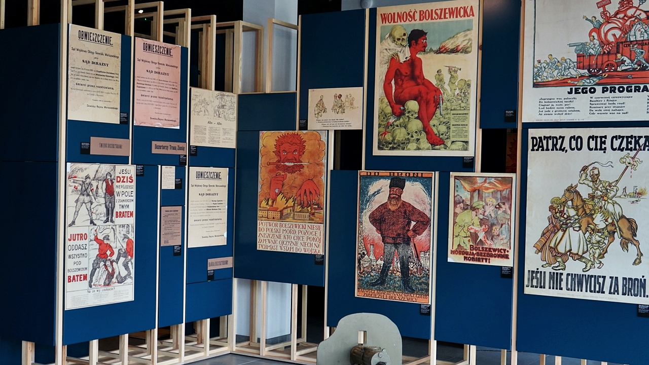 – Trzonem wystawy stałej są eksponaty. Wśród kilkuset prezentowanych obiektów znalazły się unikaty z okresu wojny polsko-bolszewickiej i współczesne dzieła sztuki upamiętniające Cud nad Wisłą – wyjaśnia Adam Bacławski, kierownik muzeum. – Część z nich to darowizny od osób prywatnych i depozyty pozyskane m.in. z Muzeum Zbrojownia na Zamku w Liwie, Muzeum Polskiego Ruchu Ludowego, Muzeum Wsi Mazowieckiej w Sierpcu, Muzeum Mazowieckie w Płocku czy Muzeum Harcerstwa w Warszawie. Jednak zdecydowana większość pochodzi ze zbiorów Muzeum Niepodległości. Na uwagę zasługuje bogaty zbiór druków ulotnych, a w szczególności kolekcja plakatów propagandowych – dodaje muzealnik.